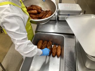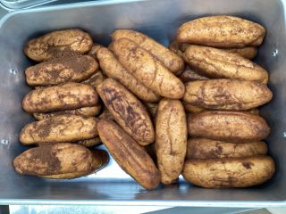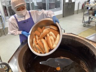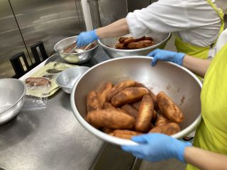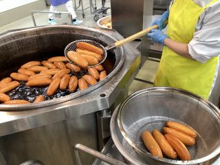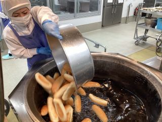 今日は、ココアパンでした。この日を心待ちにしていた人がたくさんいたので、調理員さんたちと「失敗はできない」と気合を入れて作りました。