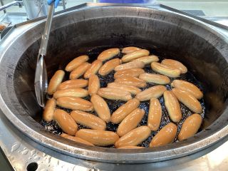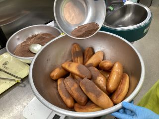 高温でコッペパンをカラッと揚げ、砂糖を混ぜたココアパウダーを全体に絡めます。