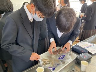 会場では食材の見本が展示され、生徒たちは実際に手に取って触ってみたり、香りを確かめていました。