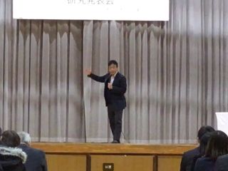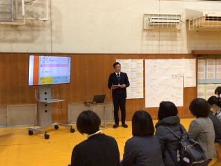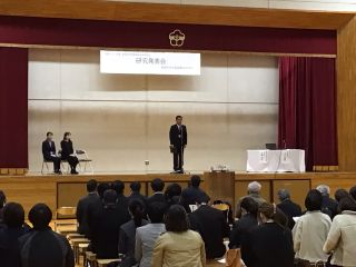 続いて全体会を開催しました。栄養教諭と研究主任から研究報告を行いました。