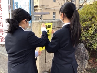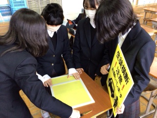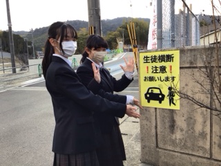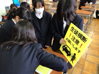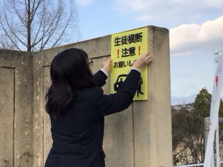 美術部 看板制作・設置 学校日誌 2026.02.06 校長先生からの依頼を受けて、美術部の1、2年生有志で校門前に「生徒横断時の注意お願い」看板を作成・設置しました。登下校の際は、車を運転されるみなさんだけでなく、生徒のみなさんも交通安全に気をつけましょう。