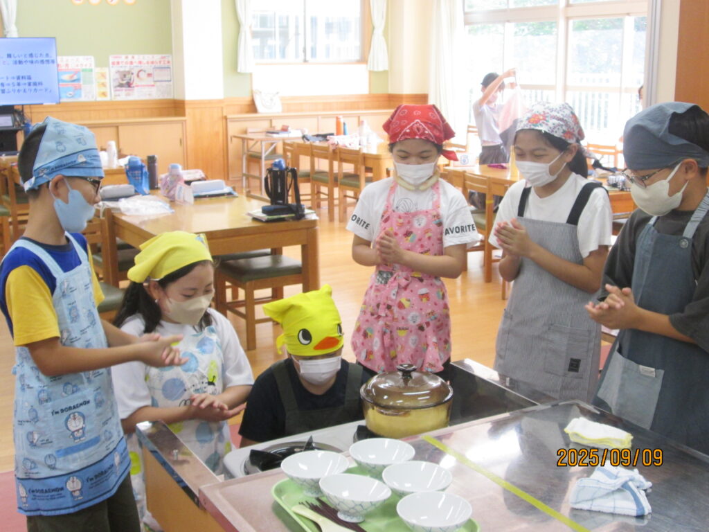 こちらのクラスも「早く食べたい!」と言いながら炊き上がるのを待っていました。ご飯を炊いている間に片づけをしたり、食べる準備をしたり…役割分担をして班で行動していることがよく分かりました。いつもいただいているご飯とは、また違うおいしさがあったのではないでしょうか。