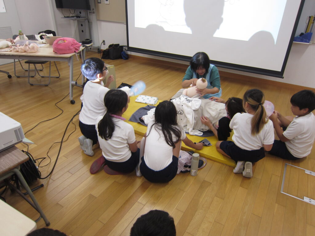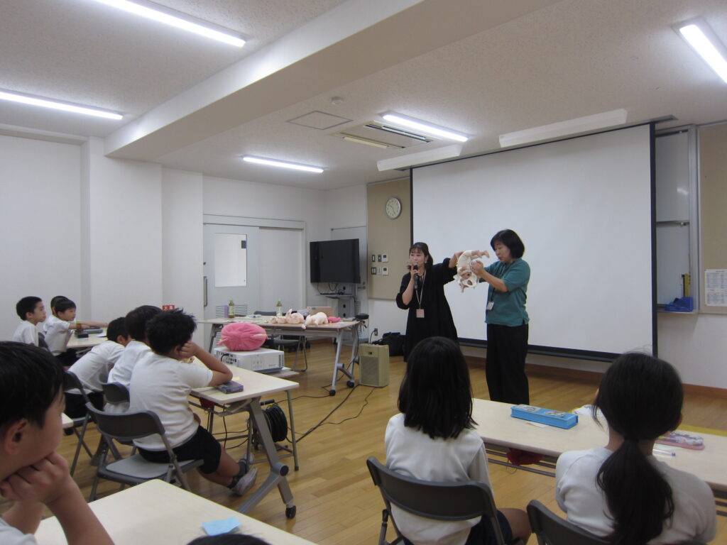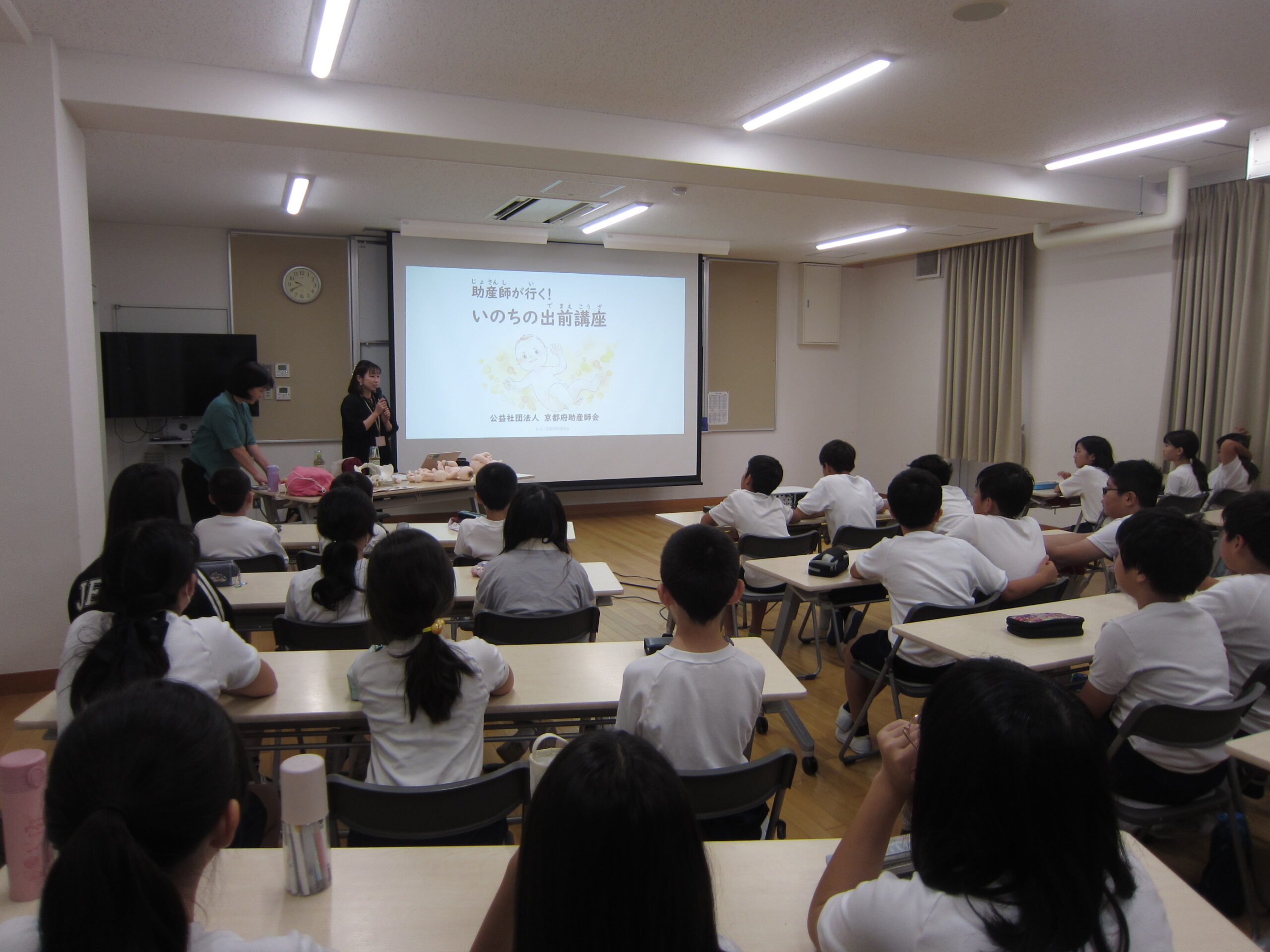 9月26日(金)に京都府助産師会から、2名の助産師の方に来ていただき、生命の誕生の仕組みなどについて教えていただきました。実際に卵子の大きさを付箋紙に穴を置けて大きさを体験させていただいたり、妊娠が進んでいくにあたっての胎児の重さを体感するために人形を持たせていただいたりと、映像や具体物、劇を通してわかりやすく、いのちの奇跡や素晴らしさについて学ばせていただきました。