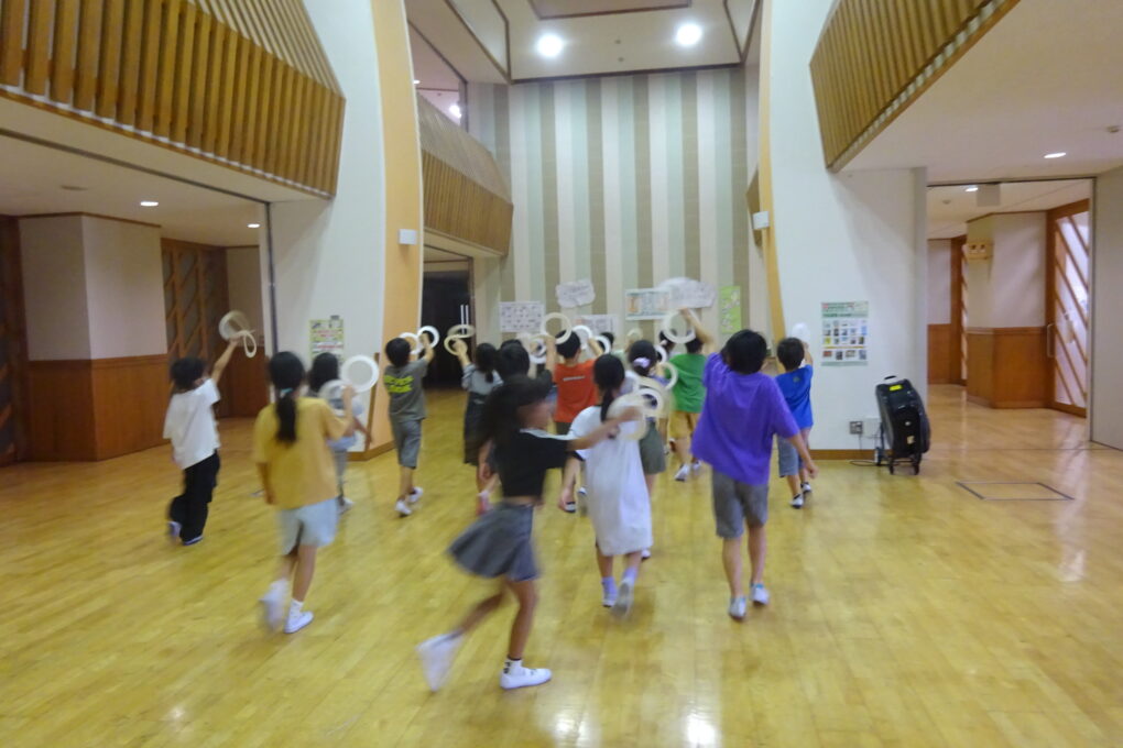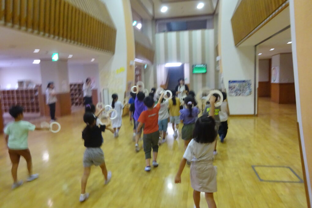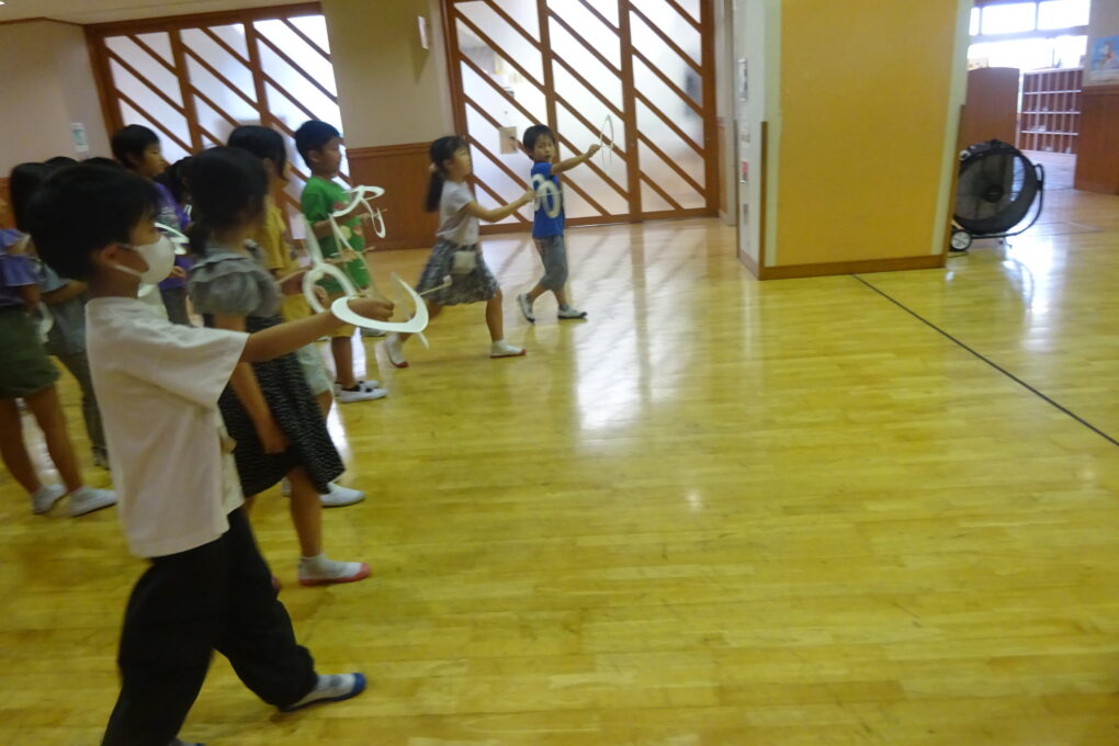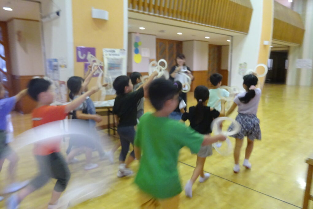 【9月】おもちゃづくりに取り組んでいる2年生。今日は、紙皿で作った風車です。外は暑いので、オープンスペースで遊んでいましたが、歩くだけでくるくると回りました。歓声をあげたいところですが、他の学年は静かに授業をしているので我慢しながらも、顔はにっこにこ楽しそうでした。