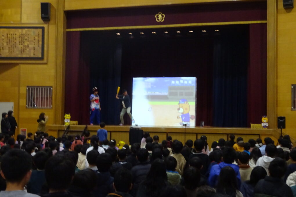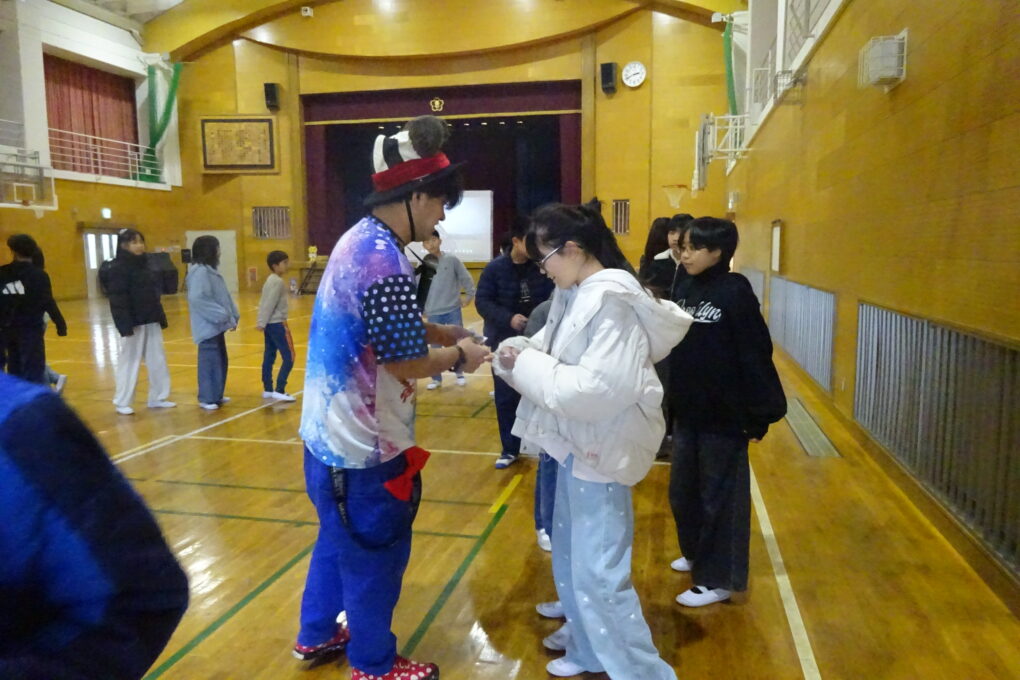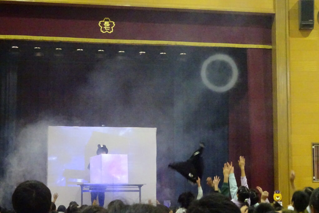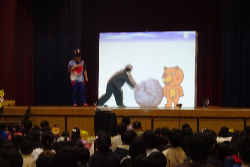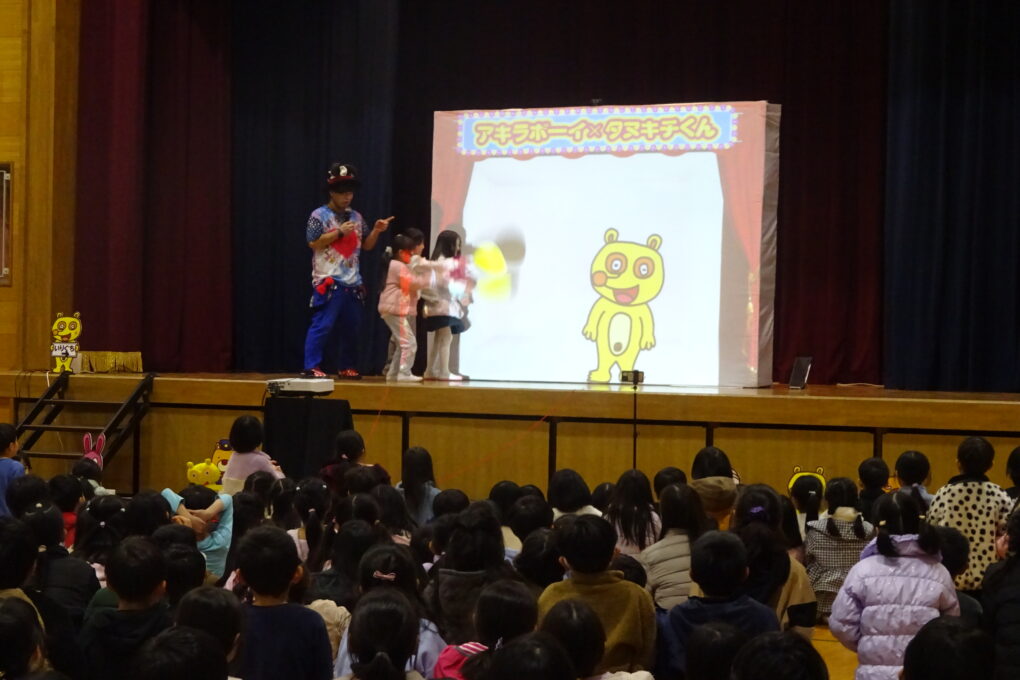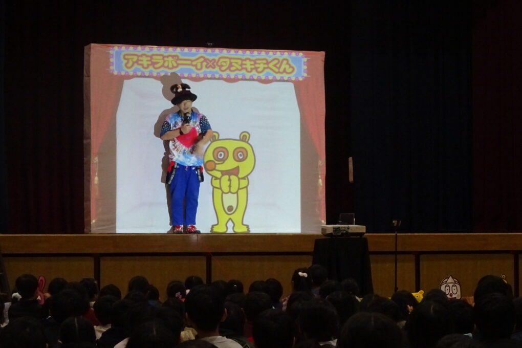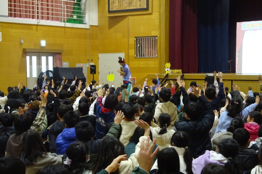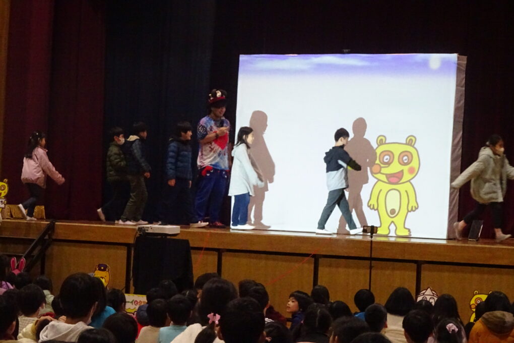 【12月22日】今日は、PTAさんが「アキラボーイさんのデジタルショー」を体育館で行ってくださいました。スマホやパソコンにプログラミングされた映像を使ったショーで、子どもたちも全員ステージに上がり、自分の動きで映像が変わっていく不思議な体験をさせていただきました。大変楽しいショーを企画してくださったPTA本部さん、ありがとうございました。