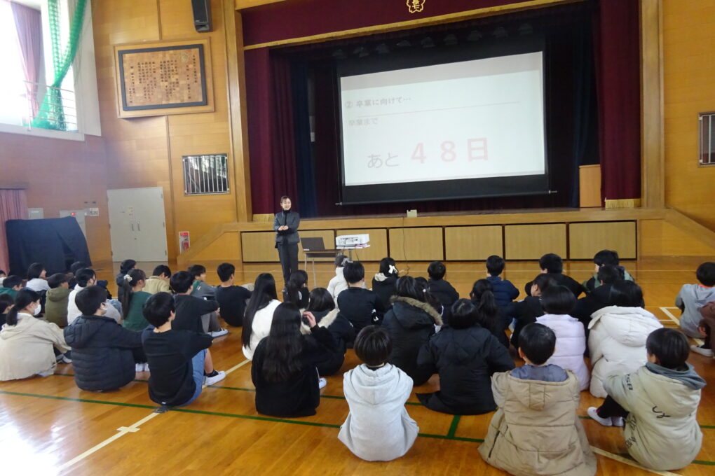 始業式では、6年生が先に体育館に来て、「静かに待つ」お手本を見せてくれました。後から入ってきた他の学年も、ピリッとした雰囲気で新学期のスタートを切ることができました。6年生は学年集会も行い、3学期の48日をどのように過ごすか担任と一緒に考えました。最後まで最高学年としての立派な姿を見せてほしいです。
