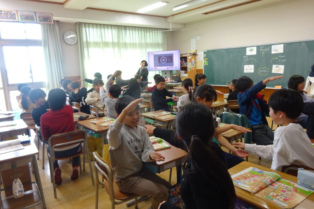 R7 長七小トピックス【1月15日】今日は、方向を表す英語について学習しました。学習した英語をAETが順番に発音していき、最初にひとつ決めていた言葉が出てきたら、一人は手をはさむ、一人は手をはさまれないようにぬきます。大盛り上がりでしたが、ペアで楽しくゲームをしながら、方向を表す英語を覚えていきました。これで、道を聞かれた時も、英語で案内できますね。