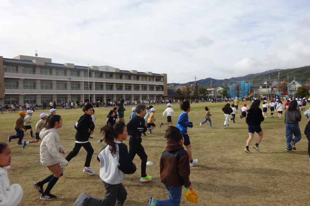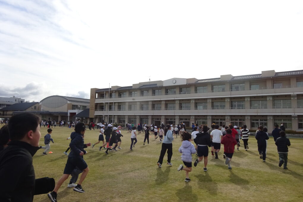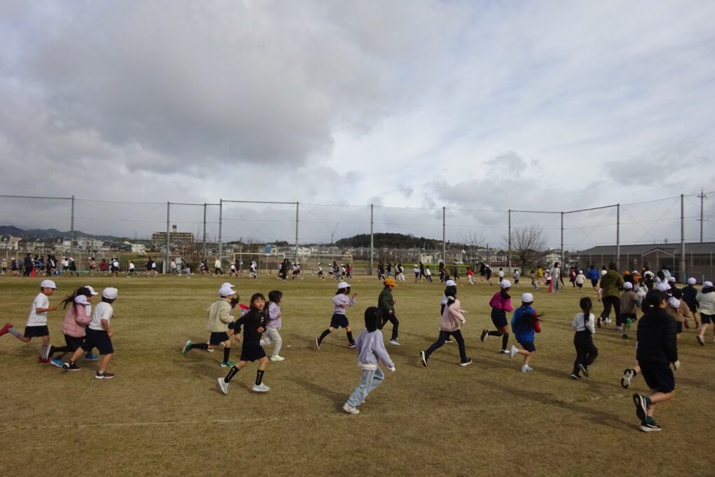 【1月20日】今年度は名前が変わり、セブンランの前に「エンジョイ」がつきました。体力向上のために毎年取り組んでいるのですが、今年は走ることを楽しんでほしいという思いを込めました。急に寒さが厳しくなってきましたが、低学年は内側を5分間、高学年は外側を7分間、グラウンドを駆け抜けます!