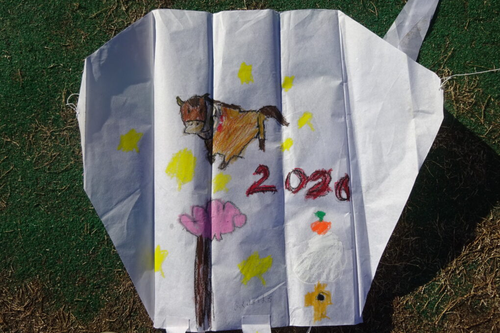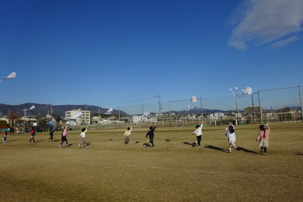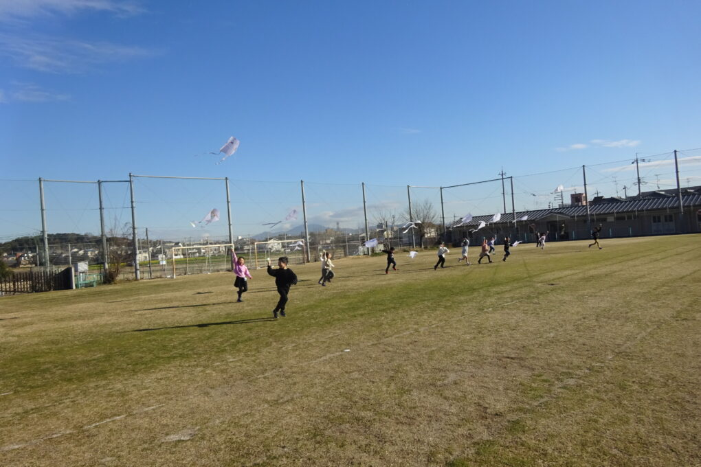 【1月22日】生活科の学習で作成した凧を上げました。友だちと糸がからまないよう距離をとりながら思いっきり走ると、凧はぐんぐん高く上がっていきました。「風がふいているね。」「走らなくてもあがっていくよ。」と気づいたことを話しながら、楽しく学習していました。