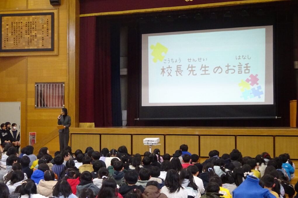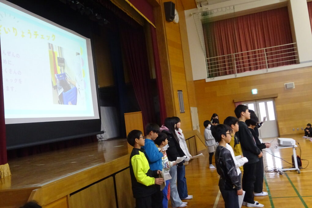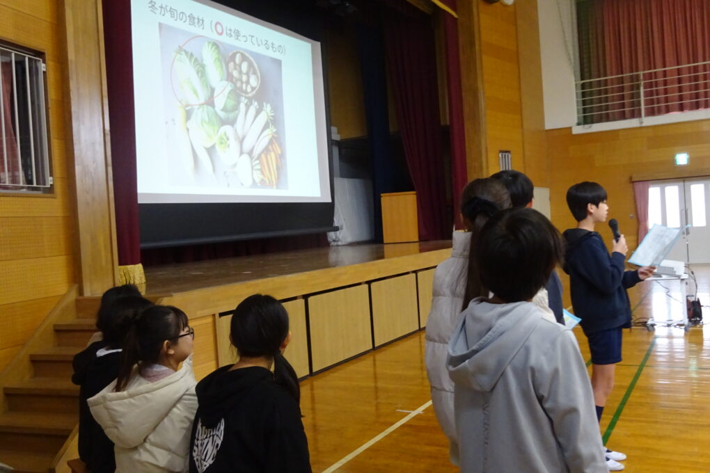 【1月26日】全校児童が体育館に集まりました。今日は給食委員会が、今日から始まる給食週間や給食ができるまでのことを発表しました。また、6年生が家庭科で学習したことをもとに考えた給食の献立について発表しました。6年生の中で選ばれた各クラス1グループが発表したのですが、実際に2月の給食に登場します。楽しみです。