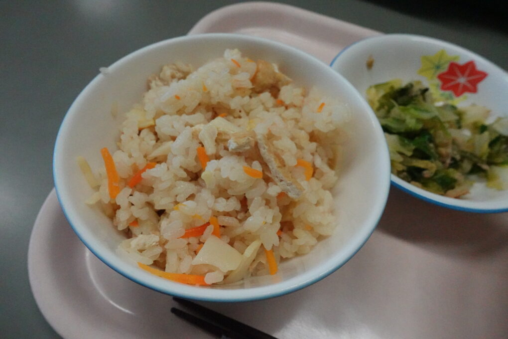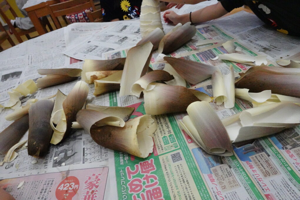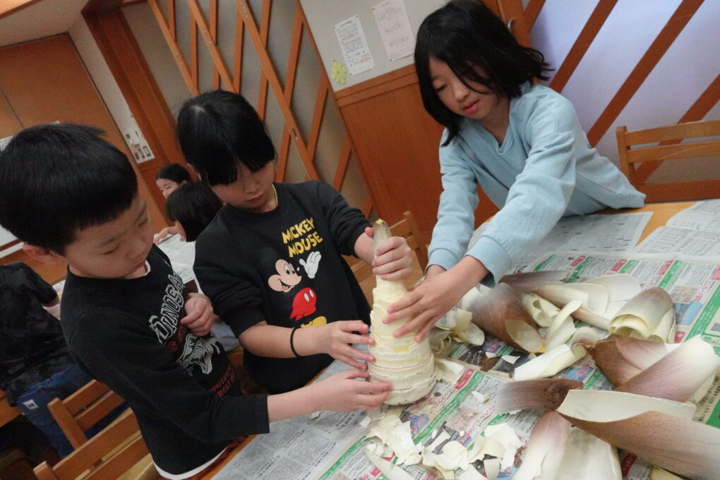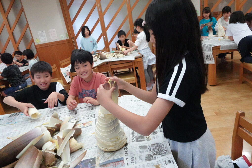 今日の給食は、みんなが大好きなたけのこごはん!…だったのですが、実は昨日3年生がたけのこの皮むきに挑戦をしていました。長岡京市の特産品としても有名なたけのこですが、まさに今がシーズンのど真ん中ということで、班ごとに分かれて大きなたけのこを観察し、さわってみたり、においをかいでみたり…そのあとみんなで協力をして皮をむきました。実際に今日の給食で出てきたたけのこごはんはとってもおいしく、どのクラスでもうれしそうに食べている姿が見られました。3年生ががんばって皮むきをしたたけのこもちゃんと入っていたようです♬3年生のみなさん、よくがんばりましたね。
