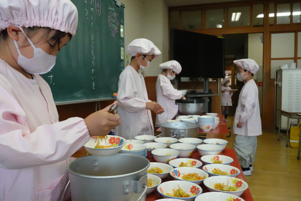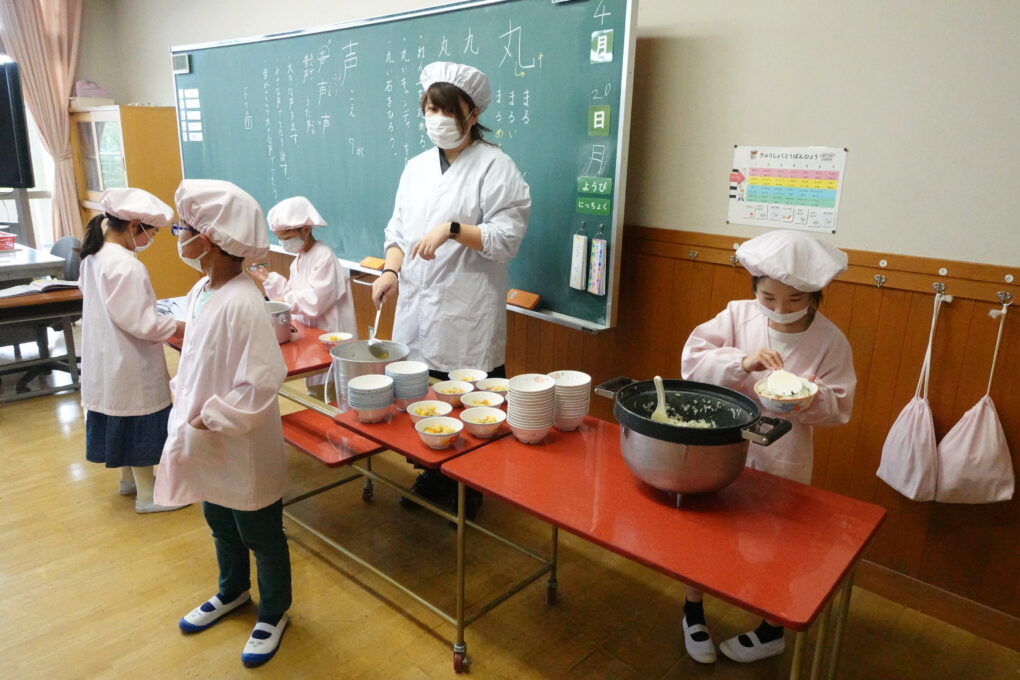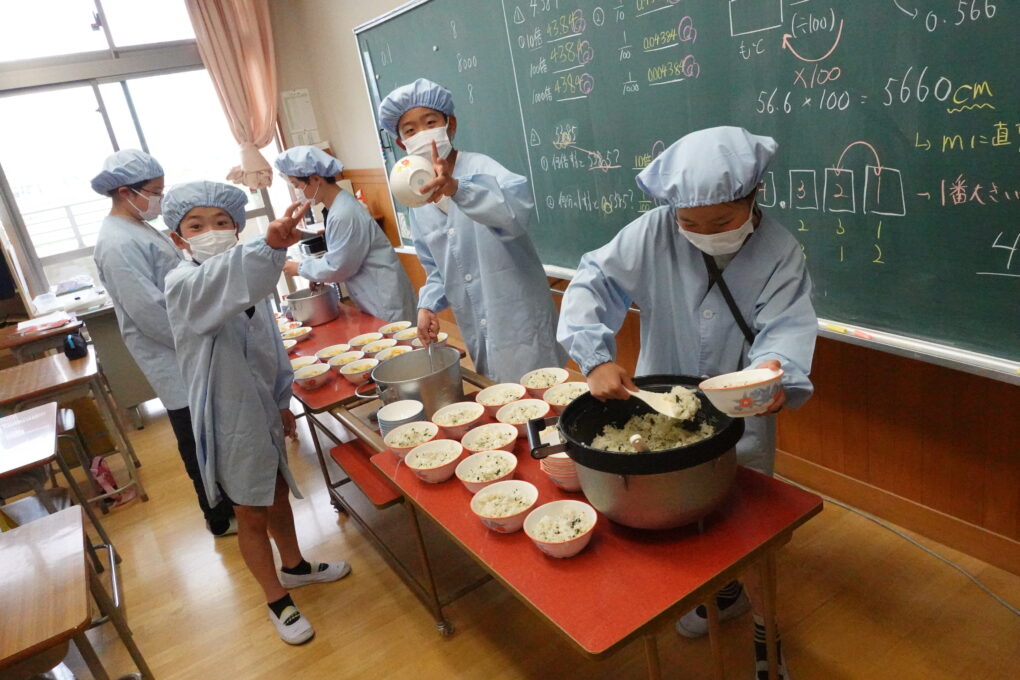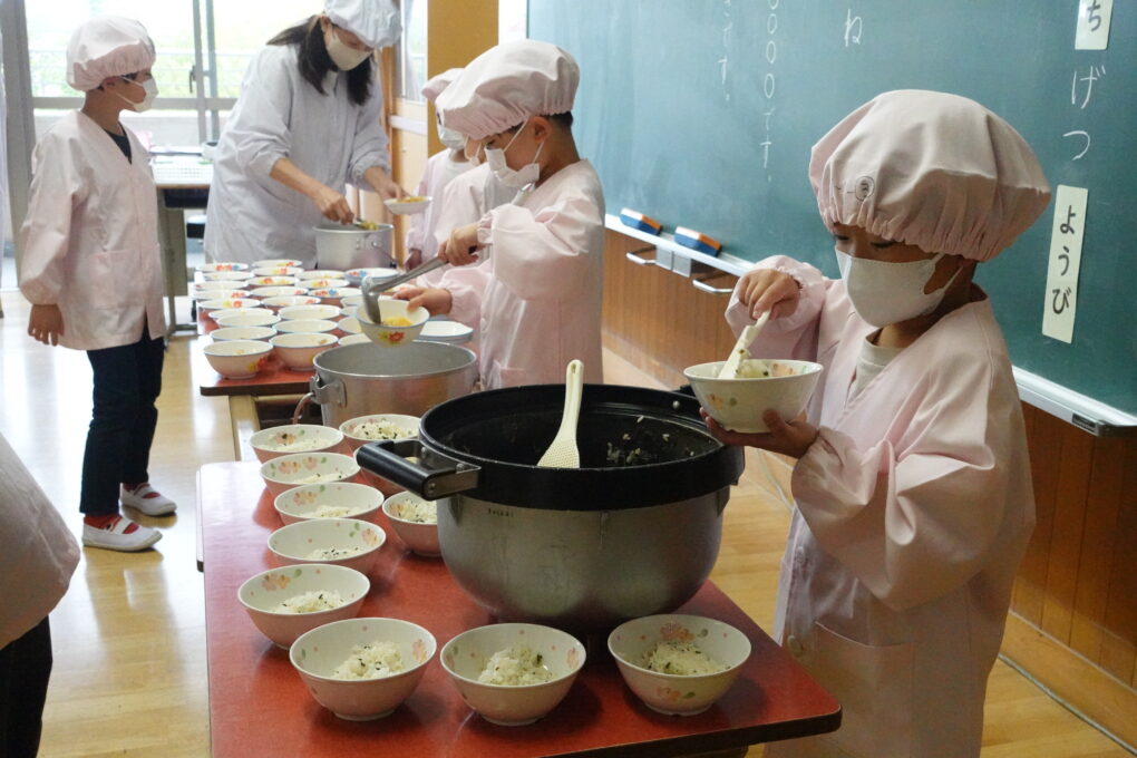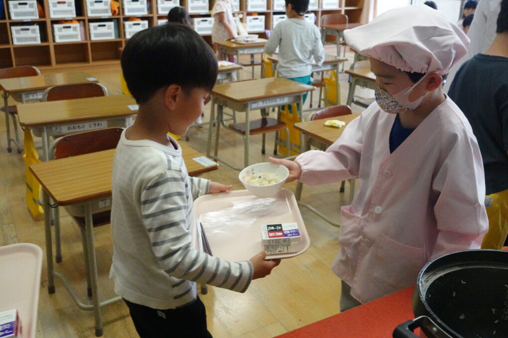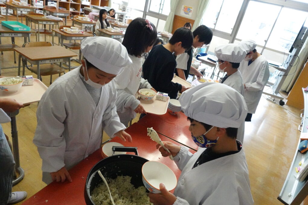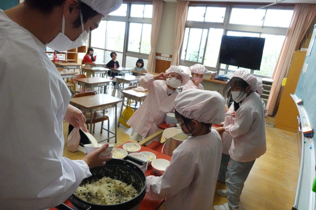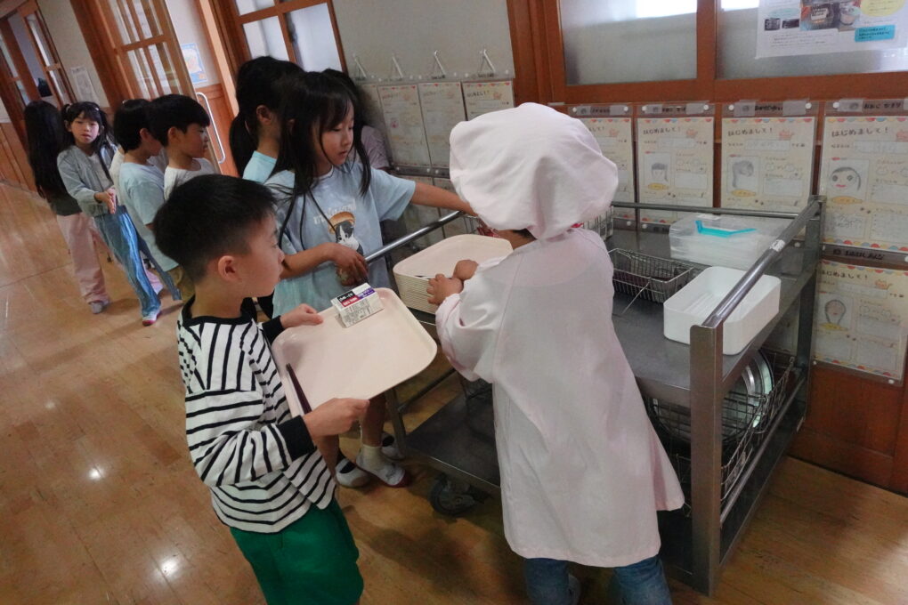 10日(金)に1年生の給食もスタートし、今週からは全校みんなが給食をいただいています。たけのこごはん、カレーライス、わかめごはんに肉じゃが…さっそく、毎日子どもたちが喜ぶ献立を考えていただいています。全校の様子を見ていると、どの学年も当番の人がきちんと量を意識してよそっていたり、落とさないように優しく声をかけながら食器を渡していたり…あたたかい雰囲気の中で給食の準備が進められていました。おかわりして食べる人もたくさんいて、今日のお残しもすごく少なかったようです。明日の給食はミートソースのスパゲティです。調理員のみなさんが毎日おいしいを作ってくださいます。明日も給食の時間が楽しみになりますね♬