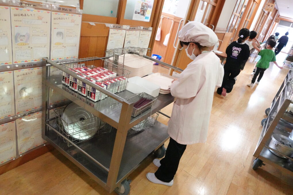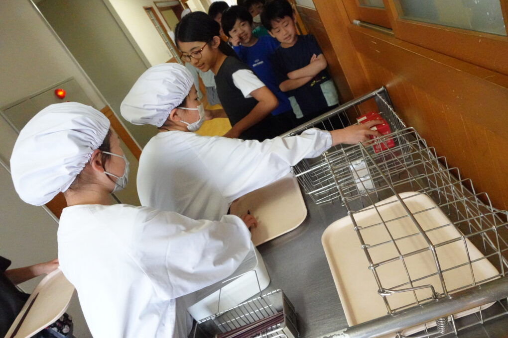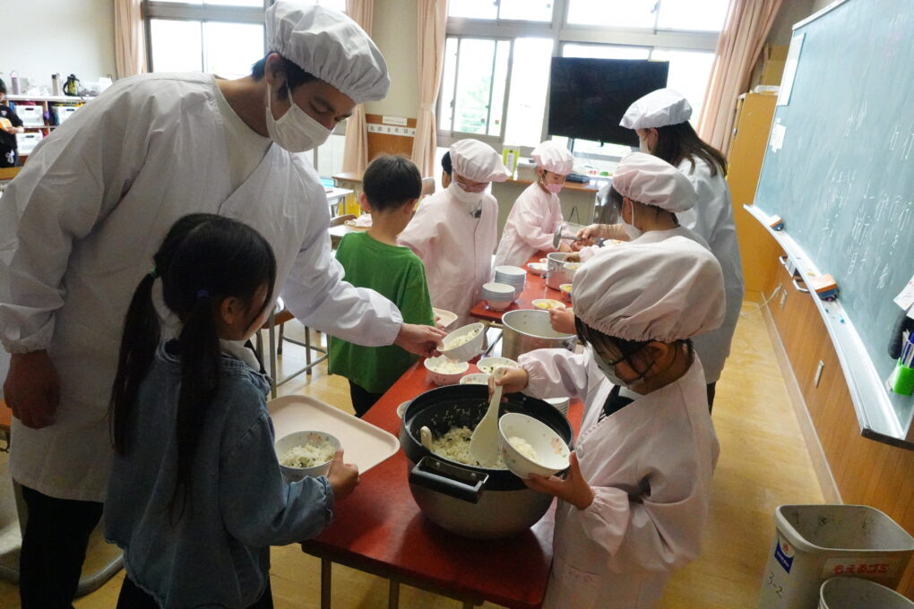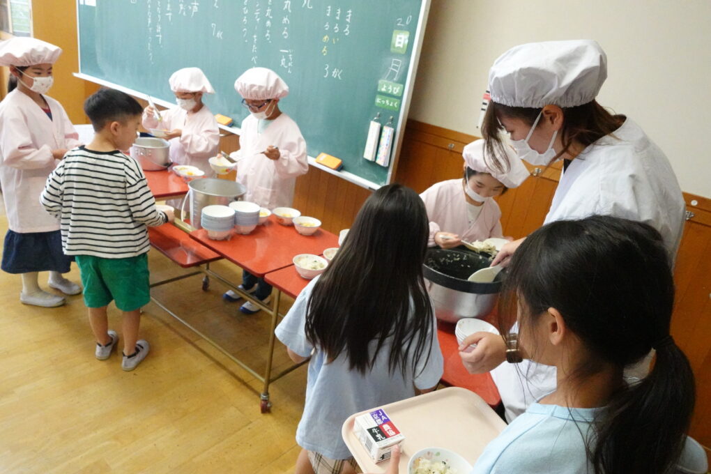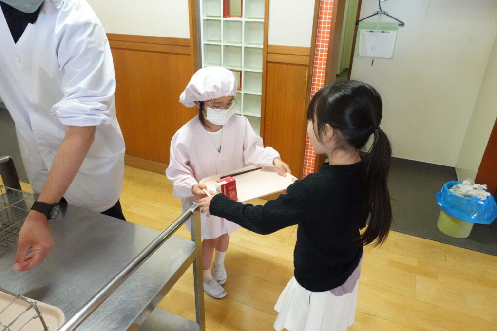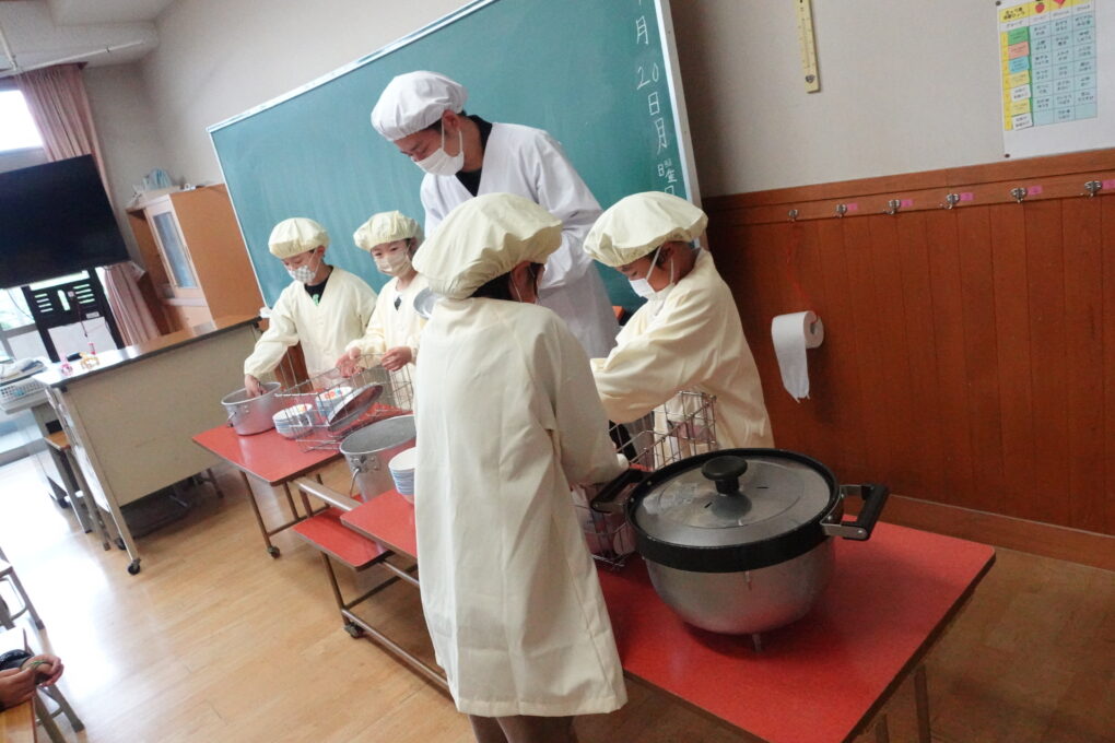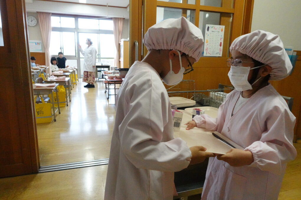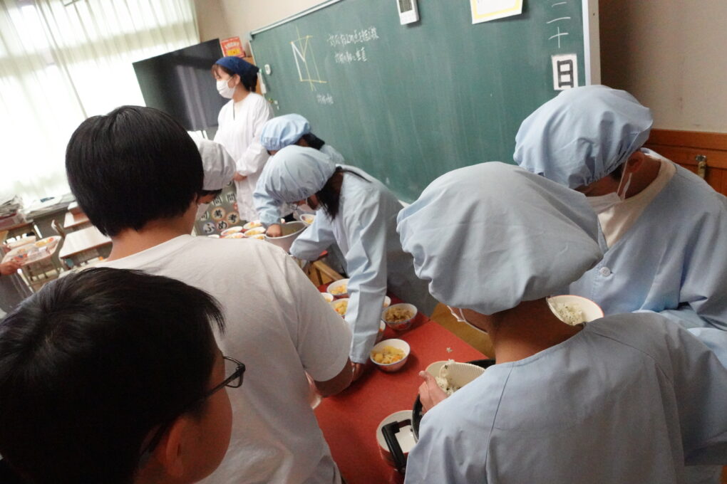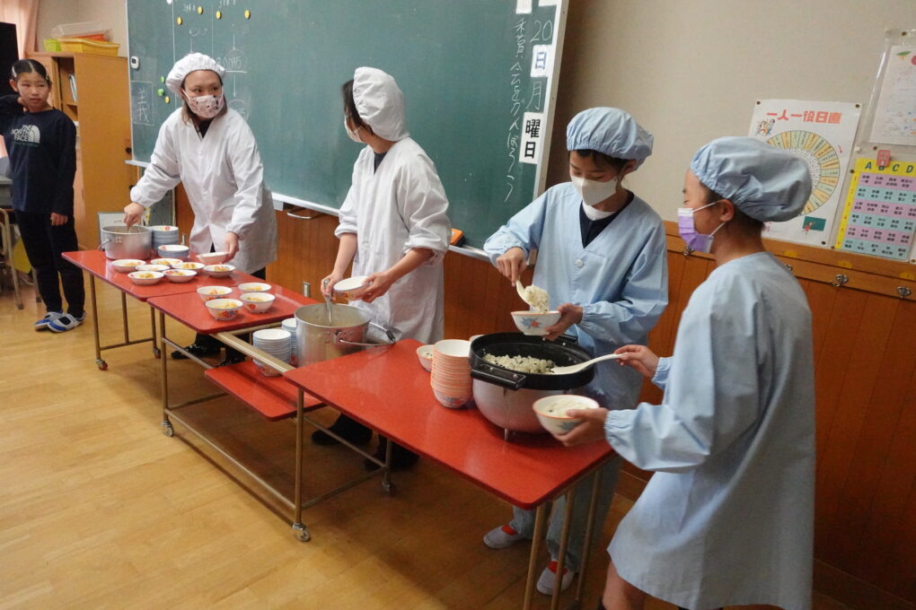 10日(金)に1年生の給食もスタートし、今週からは全校みんなが給食をいただいています。たけのこごはん、カレーライス、わかめごはんに肉じゃが…さっそく、毎日子どもたちが喜ぶ献立を考えていただいています。全校の様子を見ていると、どの学年も当番の人がきちんと量を意識してよそっていたり、落とさないように優しく声をかけながら食器を渡していたり…あたたかい雰囲気の中で給食の準備が進められていました。おかわりして食べる人もたくさんいて、今日のお残しもすごく少なかったようです。明日の給食はミートソースのスパゲティです。調理員のみなさんが毎日おいしいを作ってくださいます。明日も給食の時間が楽しみになりますね♬