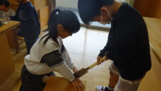 【11月13日】4年生が、のこぎりと金づちを使って工作をしています。初めて使う子も多いのですが、苦労して自分が作りたい形が出来上がってくるとわくわく感もどんどん上がっていきます。