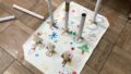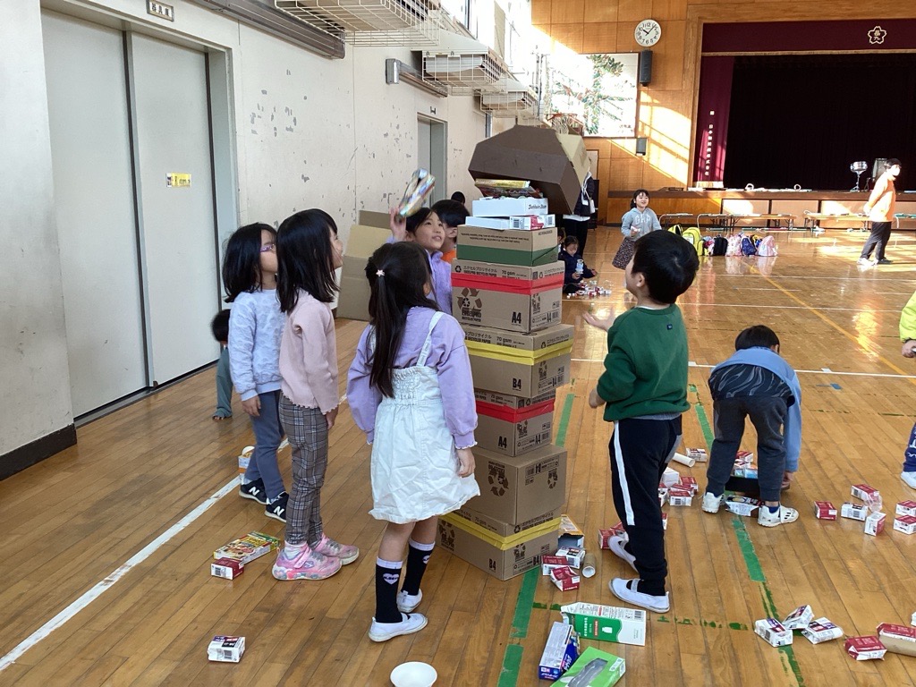 その後の造形遊びでは、1年生と園児さんがグループになり、色々な形や大きさの箱を使って並べたり積んだりしながら、思い思いに作品づくりを楽しみました。笑顔いっぱいの交流の時間となり、異年齢での関わりを通して、互いに学び合う貴重な機会となりました。