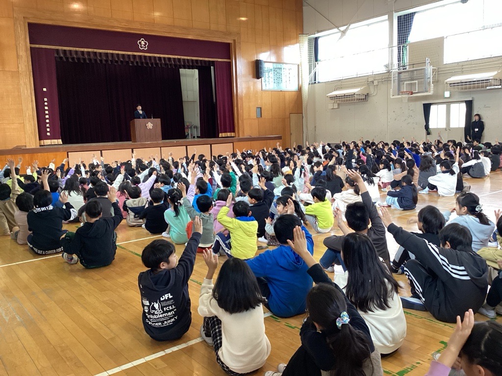 式では、奥田校長先生から、始業式で伝えられた「聴き方のレベルアップ」という目標について振り返りがありました。「自分はレベルアップできたかどうか」という問いかけに、多くの児童が自信をもって手を挙げていました。校長先生からは、「命を大切にし、楽しい冬休みを過ごして、3学期に元気な顔を見せてください」という言葉がありました。