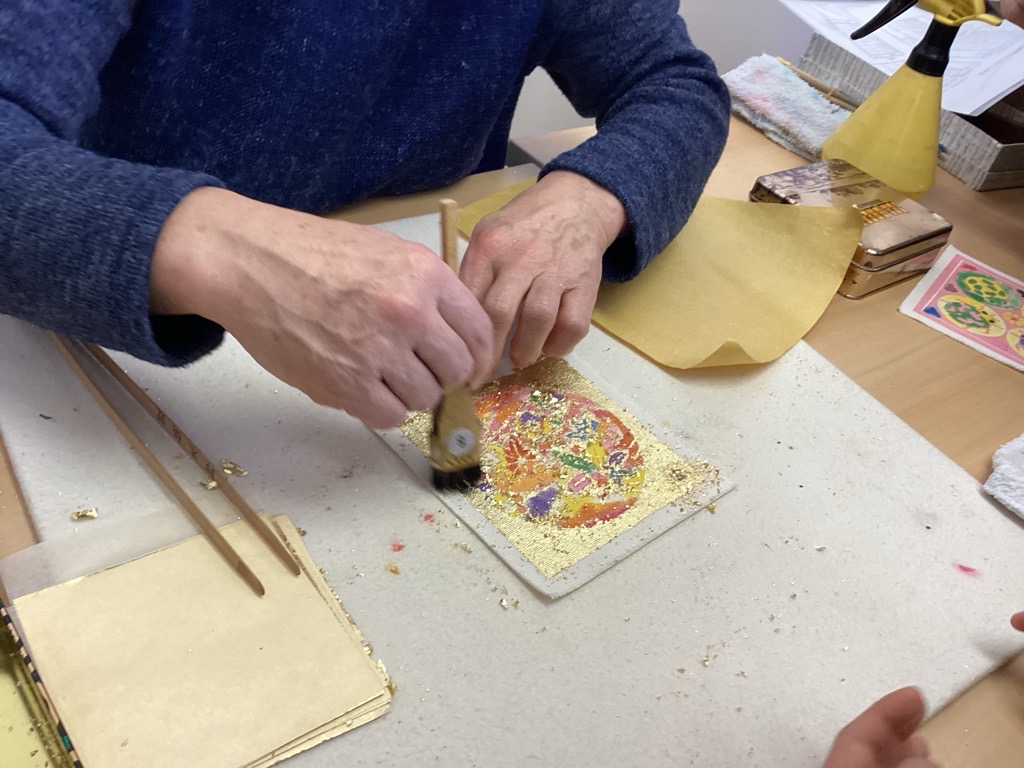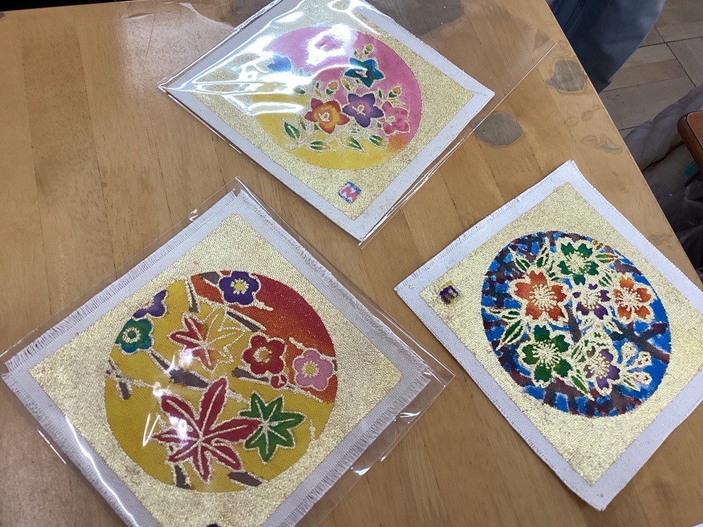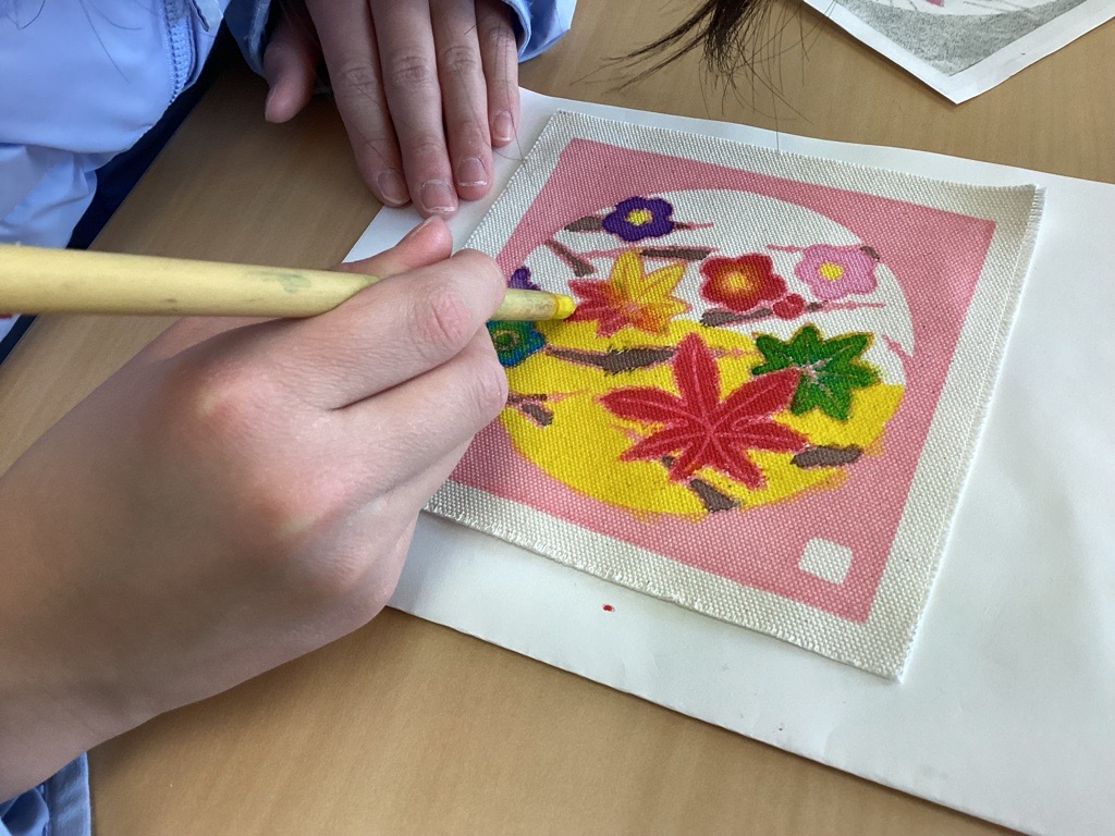 友禅染は、京都を代表する伝統工芸の一つです。児童は筆の動かし方や色の重ね方に気を配りながら、丁寧に色付けを進めていました。完成した作品を手にすると、どの子も嬉しそうに作品を見せてくれ、とても満足そうな表情が印象的でした。