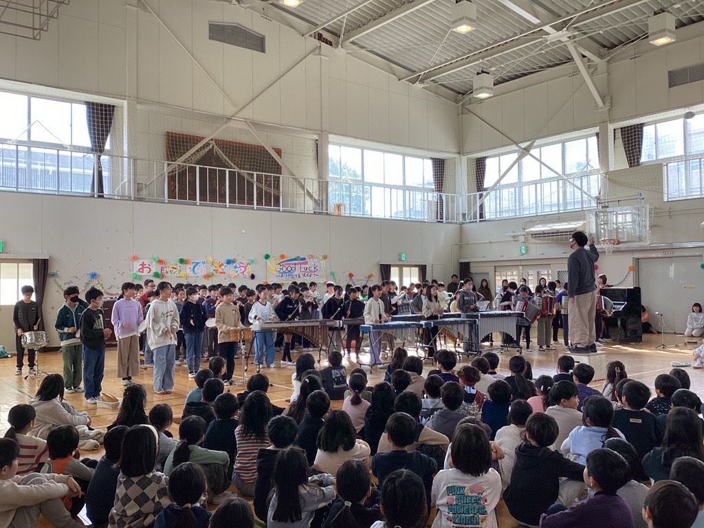 当日は、1年生からプレゼントされたメダルを胸に、6年生が温かい拍手に包まれて入場しました。入場曲・退場曲は、5年生による「ビリーブ」の合奏。心のこもった演奏が、会全体を優しく包み込みました。