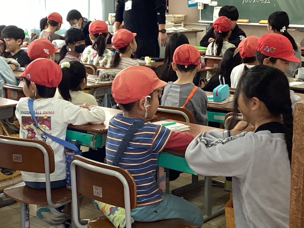 できあがった名札を首にかけたあとは、いよいよ「学校探検」へ出発。5年生は、やさしく声をかけたり、歩くスピードを合わせたりと、お兄さん・お姉さんらしい姿をたくさん見せてくれました。年長さんも、初めて入る教室や特別教室に興味津々で、目を輝かせながら探検を楽しんでいました。