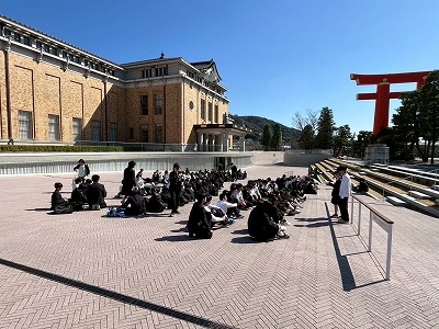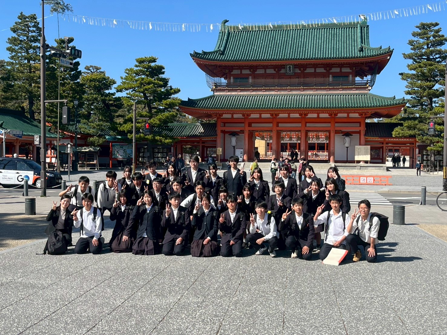 2年生 校外学習③ 学校生活の様子(日誌) 2026.03.16 班別行動のゴールは平安神宮です。 どの班も達成感に満ちあふれた表情で時間通りに集合することができました。仲間と共に協力し、活動したこの経験を修学旅行に繋げていきましょう。 14:35に平安神宮を出発し、福知山へと向かいます。