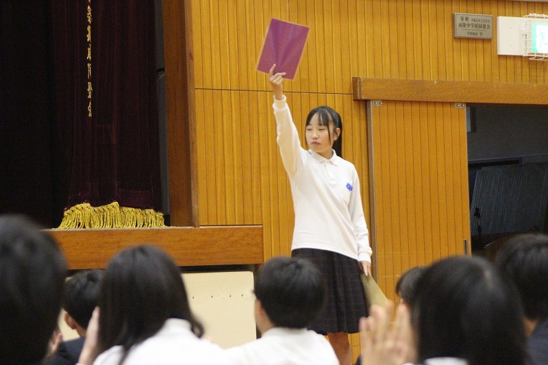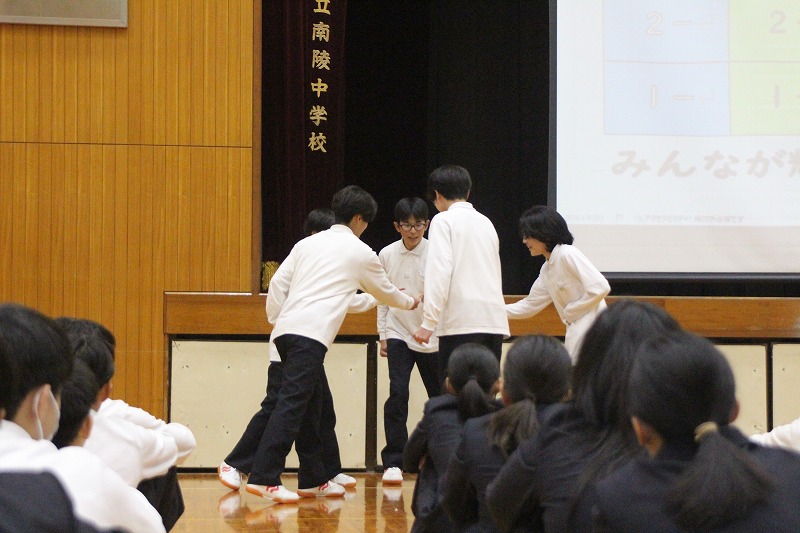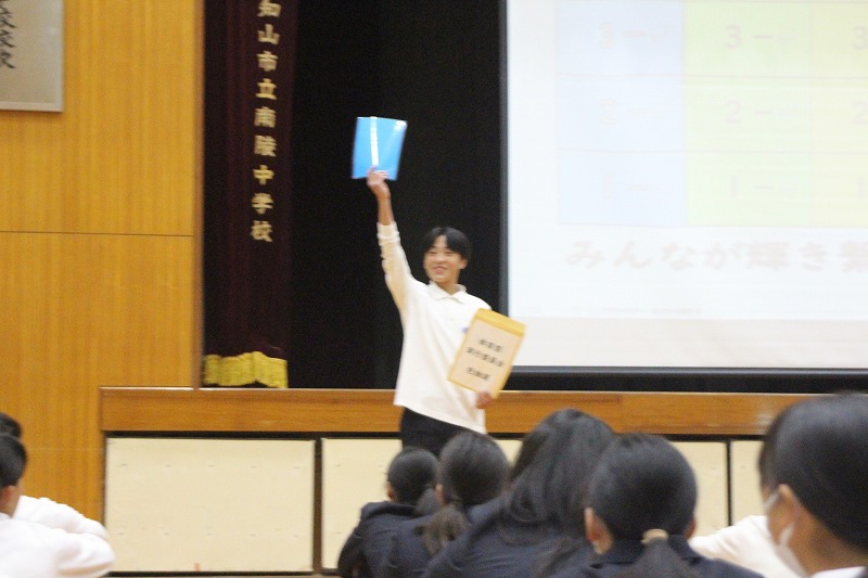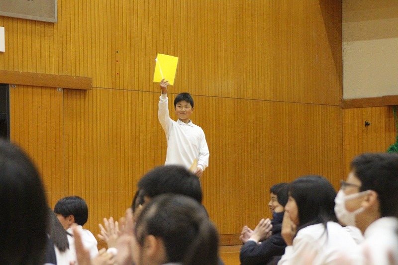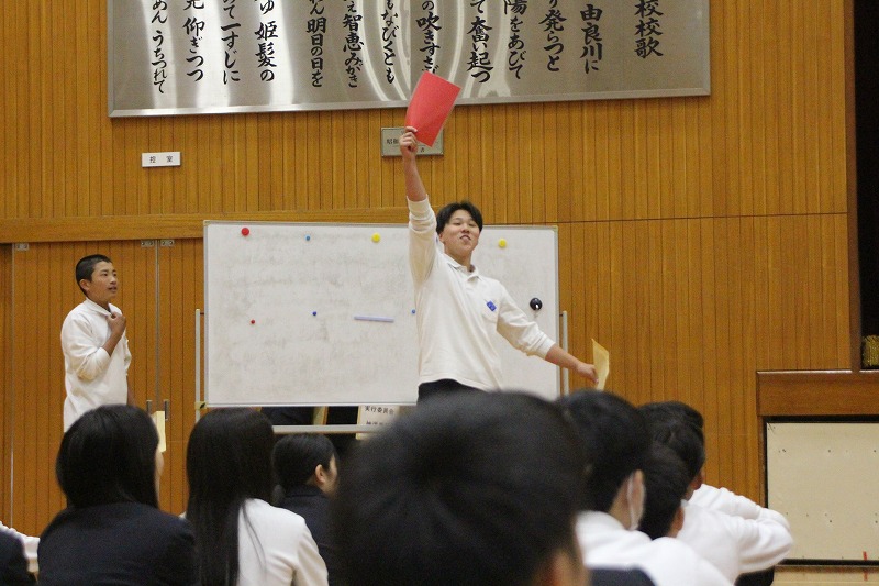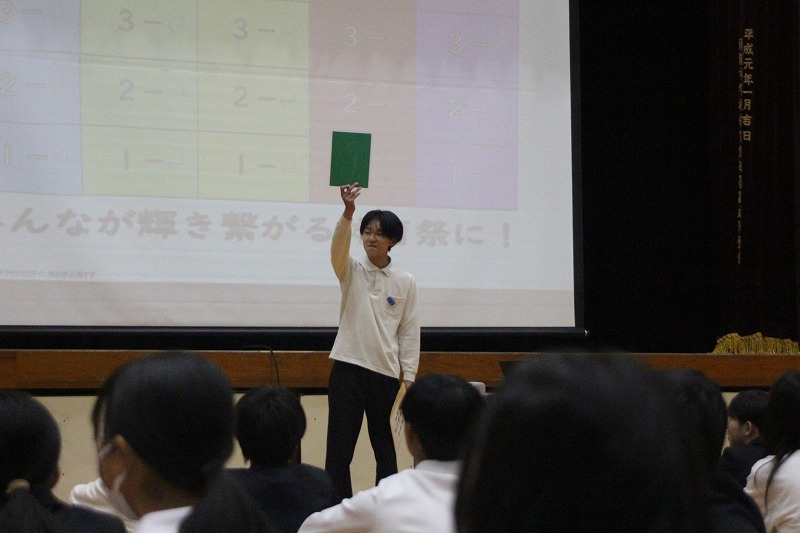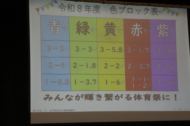 色ブロック抽選会 学校生活の様子(日誌) 2026.04.23 体育祭に向けて、全学年全学級の色を決める「色ブロック抽選会」を行いました。各学級の代表がくじを引き、赤・青・黄・緑・紫のチームが決定しました。結果が発表されるたびに歓声が上がり、会場は大いに盛り上がりました。いよいよ体育祭に向けた準備がスタートします。色ごとに団結し、思い出に残る行事にしましょう。