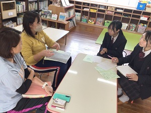 3年生の「総合的な探究の時間」では、地域の課題解決をテーマに探究活動を行っています。その中で、「子どもファースト」分野に取り組む2名の生徒が、11月6日(木)に「亀岡市立森の自然こども園東本梅」を訪問しました。