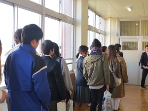 校舎・施設見学では、図書館や情報処理室、理科の実験室、グラウンド、体育館、工業実習棟などの施設を見学していただきました。
