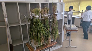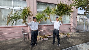 3年生の「総合的な探究の時間」では、地域の課題解決をテーマに探究活動を行っています。その中で、「地域資源活性化」分野に取り組む4名の生徒が、11月20日(木)に校内で自分たちが育てて収穫したお米を炊き味わいました。 1学期、授業が始まって地域研究について調べている中で、毎年使われずに処分されてしまうお米の苗があることを知り、「学校でお米を育ててみたい」と考えました。そこで農業組合から苗を譲ってもらい、プランターや段ボール箱に植えて育て始めました。水やりなどの世話をしながら、成長の記録も欠かさず、大切に育てました。