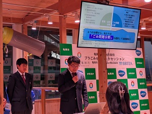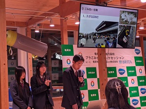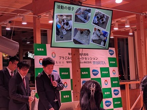 本イベントには亀岡高校の生徒も参加し、各校が1年間取り組んできたペットボトルなどの使い捨てプラスチックごみゼロに向けた実践的な取組の成果について発表とトークセッションを行いました。