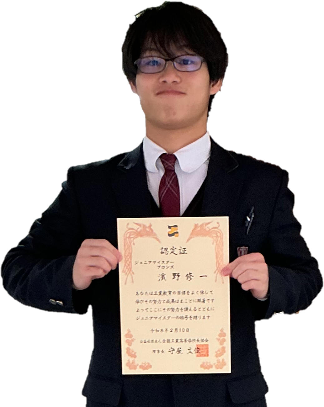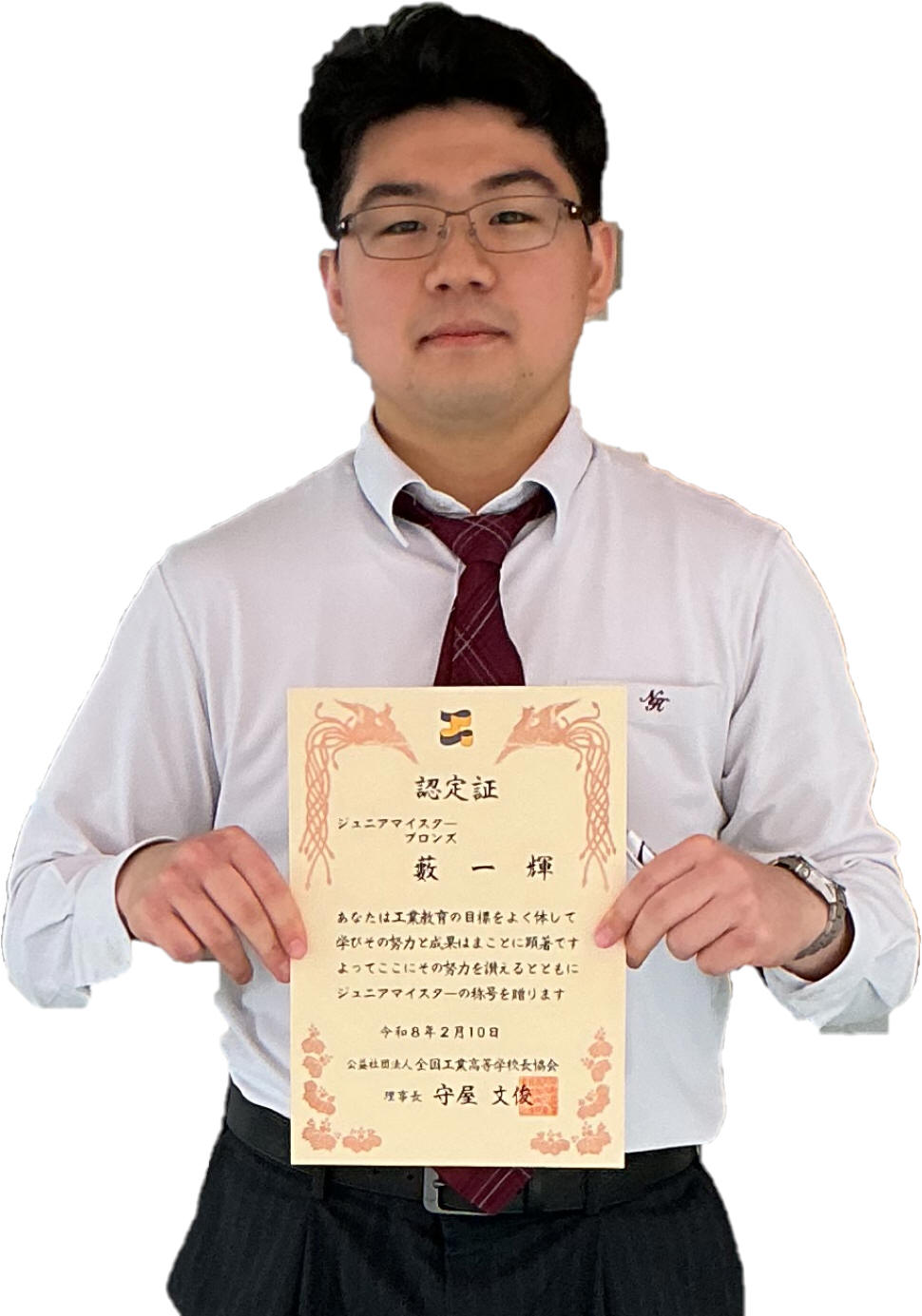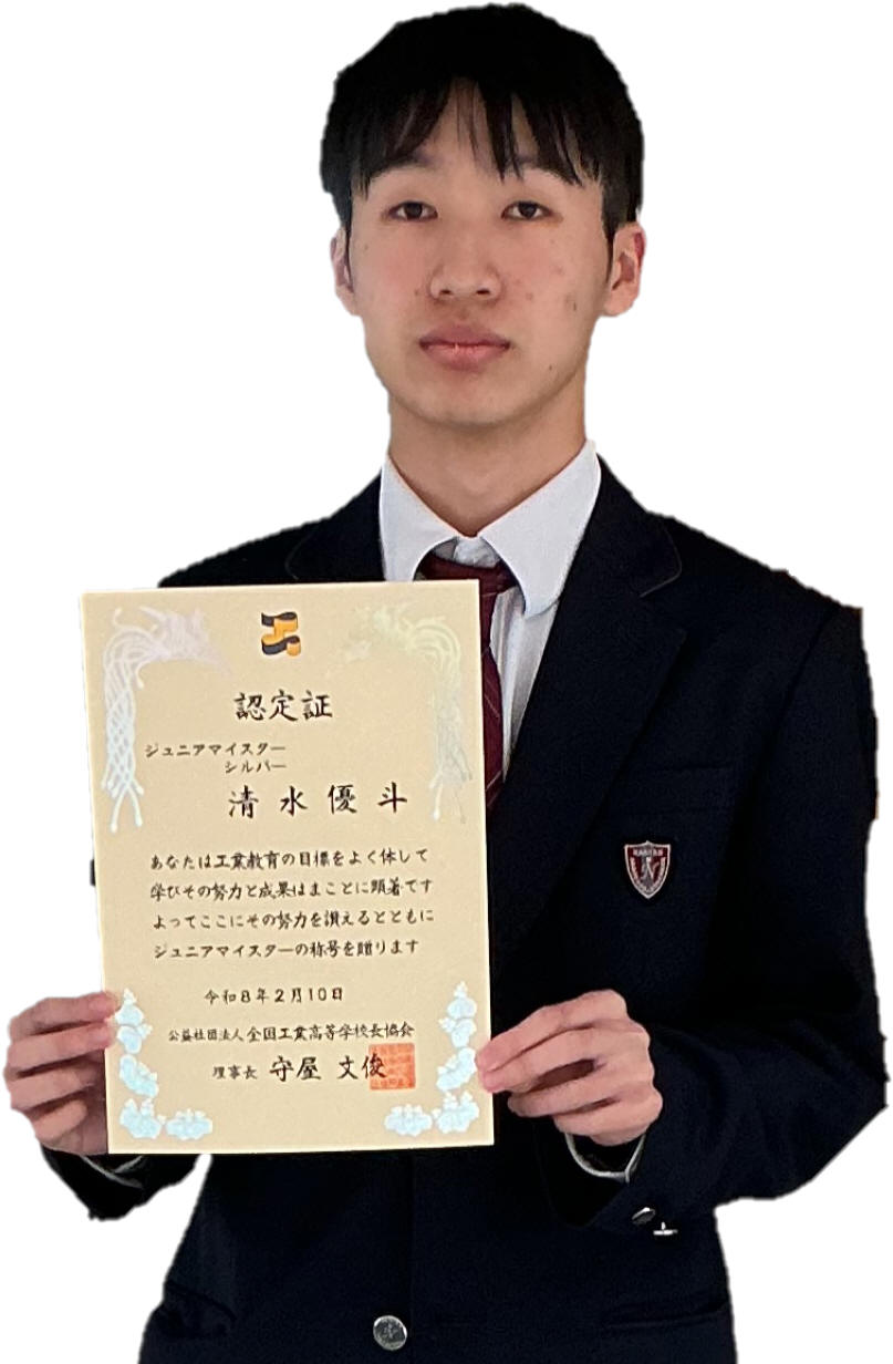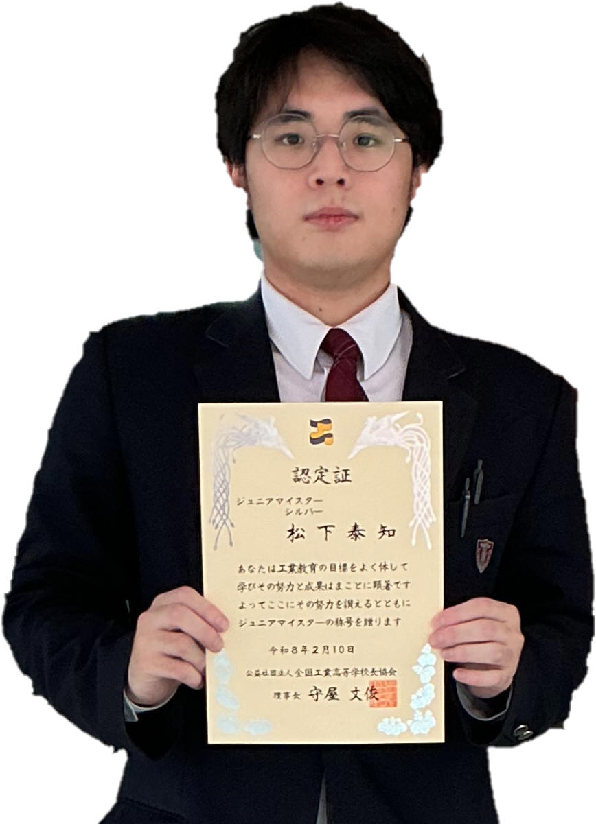 | 全国で工業を学ぶ学科に属する生徒を対象に、在学中に身につけた知識・技術・技能が評価される ジュニアマイスター顕彰制度においてテクニカル工学系列3年生、7名が認定されました。 認定は資格・検定の難易度や取得数に応じて特別表彰・ゴールド・シルバー・ブロンズに分類されます。 |
