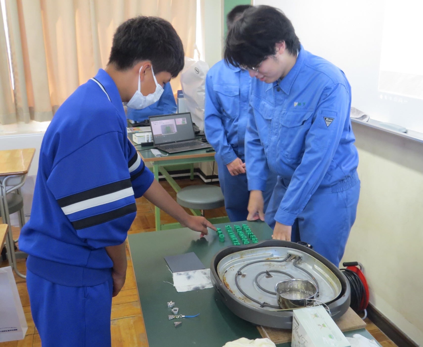 本校からはテクニカル工学系列3年生2名が「オリジナルボールペン」の製作に 取り組み、来場者が希望された文字をボールペンに刻印しました。