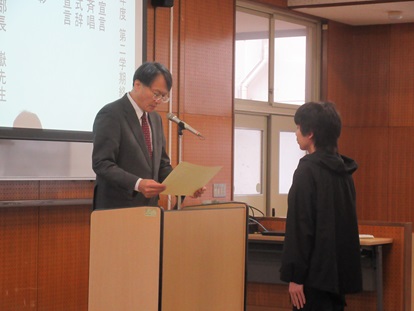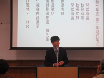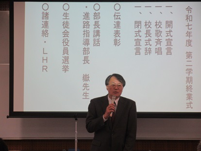 【令和7年度第2学期終業式】 学校生活 2026.01.05 令和7年12月20日(土)、第2学期終業式を執り行いました。校長式辞では、2学期行事の振り返り、また、災害に対する普段の危機管理意識を高めることへ啓発がありました。 閉式後、各種大会で優秀な成績を収めた生徒への伝達表彰式を実施しました。その後、進路指導部長講話を行い、進路指導部長が、仕事を選択する上で自己分析をすることの重要性について話しました。 なお、第3学期始業日は、令和8年1月11日(日)となります。 全体の様子 校長式辞 伝達表彰 進路指導部長講話 Post Views: 32