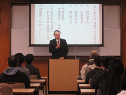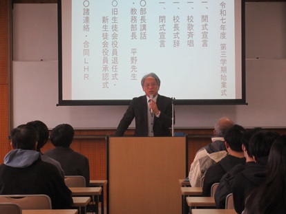 【令和7年度第3学期始業式】 学校生活 2026.01.14 令和8年1月11日(日)、第3学期始業式を挙行しました。校長式辞では、誤った情報や偏見、フェイクニュース等への注意喚起、学校での学びを活かすことの大切さについて話がありました。閉式後、教務部長講話があり、楽な方に流されず、自分で考えて動くことの重要性についての話でした。 最後に、合同ロングホームルームで、今後の学校生活について諸連絡を行いました。 校長式辞 教務部長講話 Post Views: 11