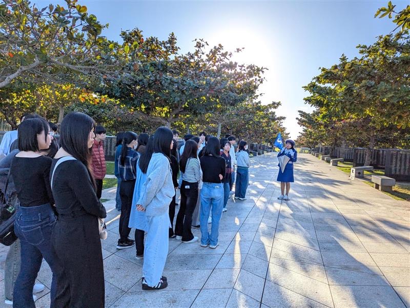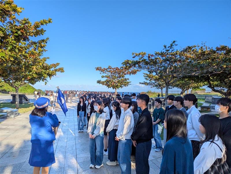 次の目的地である「沖縄平和記念資料館」では、クラス写真の撮影をしました。バスガイドさんの案内で国籍や軍人、民間人の区別なく、沖縄戦などで亡くなられたすべての人々の氏名を刻んだ記念碑「平和の礎」を見たあと、少し散策をしました。