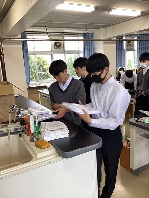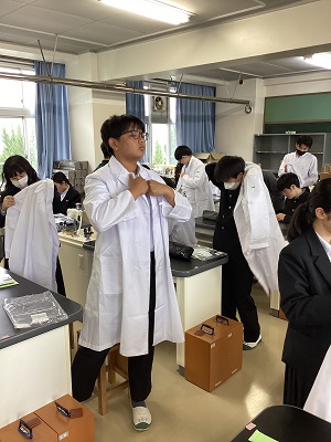 4月23日(火)7限に1年生探究基礎生物の授業で白衣の配布を行いました。理数探究科の生徒は実験を多く実施するため、白衣を購入します。その白衣が配布され、みんなわくわくした様子で袖を通していました。