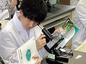 その後、顕微鏡観察を行いました。顕微鏡の操作方法や見え方について確認し、印刷物のインクの付き方や、血球などの永久プレパラートの観察を行いました。ピントがきちんと合って観察できるとうれしそうに隣の生徒と声を掛け合っていました。