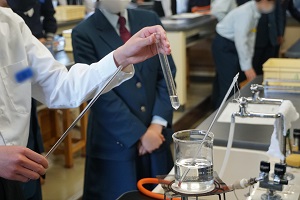 当日は、理数探究科の概要説明の後、化学と数学の体験授業を実施しました。化学では化学合成により匂いの成分となる分子を合成しました。また、数学ではグループワークによる言語活動を通して図形の問題に挑戦しました。