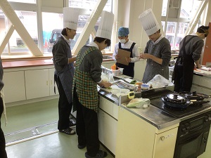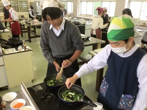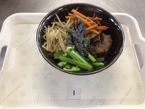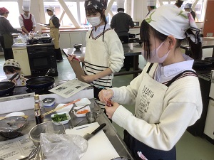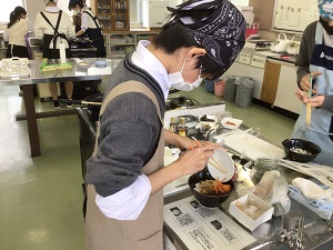 西舞鶴高校の家庭科授業では、一人分の材料を準備し、自分の分を最初から最後まで一人で作ります。今回も、全員が上手に石焼き風ビビンバを完成させることができました。ある生徒に、「上手にできたね。家でもよく料理をするの?」と尋ねると、「いえ。一人で全部作るのは初めてでした。でも、班のみんなに教えてもらって、作れました。」と笑顔で話していました。教えるときは、手は出さず説明だけ、みんなが自分一人で完成させるというルールで実習に取り組みましたが、仲間と支え合うことで、初めてのこともやりきる西高生の姿がここにも見られました。