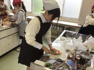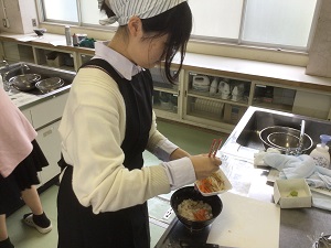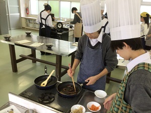 家庭基礎の授業で、今年度初めての調理実習を行いました。エコ・クッキングの方法を取り入れ、石焼き風ビビンバを作りました。エコ・クッキングは、環境を思いやりながら、「買い物」「調理」「食事」「片づけ」をすることです。ごみを減らし、エネルギーを上手に使う工夫をしたり、水を大切にし、生ごみの捨て方に配慮したりして、実習を行いました。