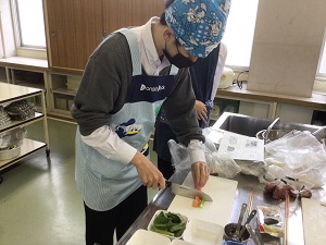小松菜とにんじんを同じ長さに切るために工夫しました