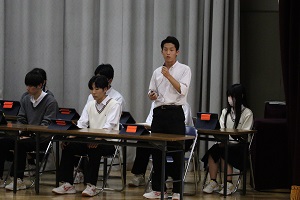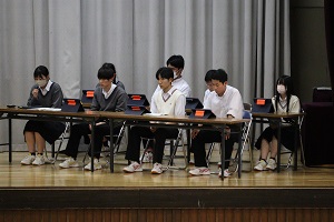 生徒総会は今年度から資料をタブレットに配信して行いました。決算報告と予算案が審議され、承認されました。