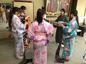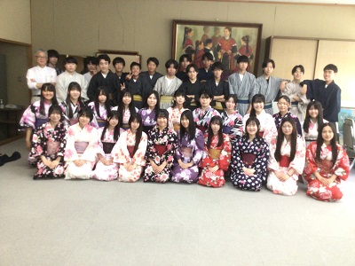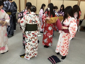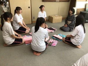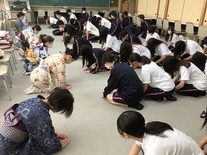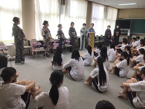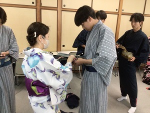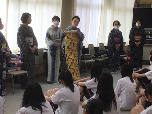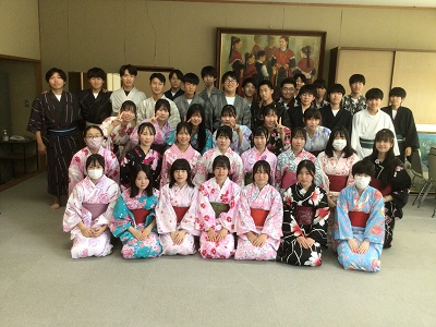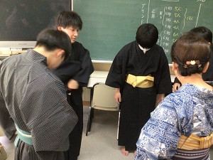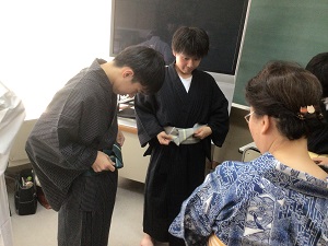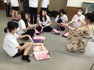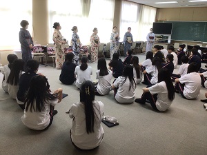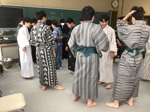 初めに座礼を教えていただき、お稽古が始まりました。浴衣の歴史や特徴についての講義の後、男女別でグループに分かれ、浴衣の着方、帯の結び方を実習しました。初めて浴衣を着る生徒も多く、最初は慣れない手つきで苦労している様子でしたが、講師の先生にコツを教えていただき、何度か練習するうちに少しずつ上達し、上手に着ることができました。「上手にできた」または「できた」と回答した生徒が94%、機会があれば浴衣や和服などを「積極的に着てみたい」または「着てみたい」と回答した生徒は99%でした。生活様式の変化等によりきものを着る機会は大きく減少しましたが、感性豊かな若い世代が直接きものに触れることで、きもの文化の継承・発展に大きな役割を果たしてほしいと思います。3~5組は7月に同様の教室を実施します。
