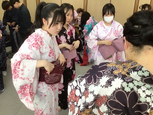 ■浴衣を自分で着ることが初めてで難しかったけれど、先生方の指導のおかげで上手く着ることが出来たと思います。浴衣を着る上でも沢山のポイントや、気をつける事などがあって、難しいし、大変だとすごく感じたけれど、上手く着付けする事が出来たら大変な分嬉しかったし、いつもと違う自分になることが出来たのですごく良い経験になったと思います。家に浴衣があるので、夏祭りとかに自分で着付けしてみようと思いました。