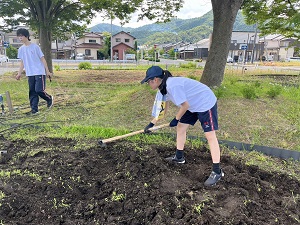 雑草がある程度とれると、今度は土壌づくりに取り組みました。培養土や堆肥をまき、養分の減った土を再生していきます(何と20袋分!)。耕すのは重労働でしたが、皆の力でやり切りました。