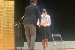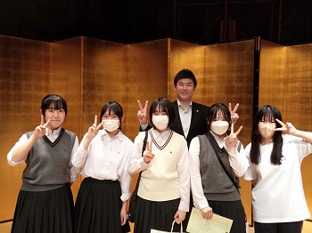 U-22審査員賞に輝いた、書道部坂北さん、写真部伊野さんが表彰式に出席、舞鶴市長様から賞状を授与していただきました。他に入選した仲間とともに記念写真を撮影しました。