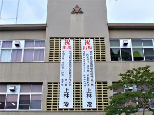 上林さんの全国大会出場を祝して、懸垂幕を本校玄関前校舎に掲げています。