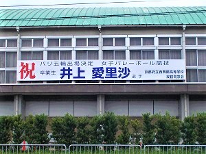 また、本校卒業生の井上愛里沙選手がパリ五輪女子バレー日本代表メンバーに選ばれたことを祝して、横断幕を体育館に掲げました。