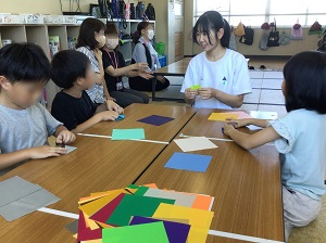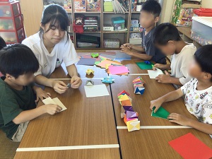 ■初めて参加しましたが、たくさんの学びがあり、とても楽しかったです。計画を立てて行きましたが、思い通りに進なかったこともありました。新聞ジャンケンを実際にやってみて、先に負けた子も楽しめるように対応できたら良かったと思いました。また新聞の折り方で勘違いをしていた子もいたので、ルールをもっと詳しく確認していたらもっとみんな楽しめたのかなと思いました。折り紙では、最初みんな違うものを折りたがったり、乗り気じゃなかったりという子もたくさんいました。そこで、「誰が1番綺麗に折れるかな?」とか、「最初はこれを作って、その次に、みんなの好きなものを作ろう。」と声かけをすることで、みんな、折り紙を楽しんでくれたので良かったと思いました。