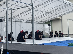 書道部では、「群青賛歌」という曲に合わせて大きな作品を書き上げるパフォーマンスを披露しました。吹奏楽部では、「銀河鉄道999」「青と夏」「mela!」「ヤングマン(Y.M.C.A)」の4曲を演奏しました。