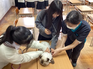 猫のピカソちゃんに聴診器をあてて心臓の音を聞きます